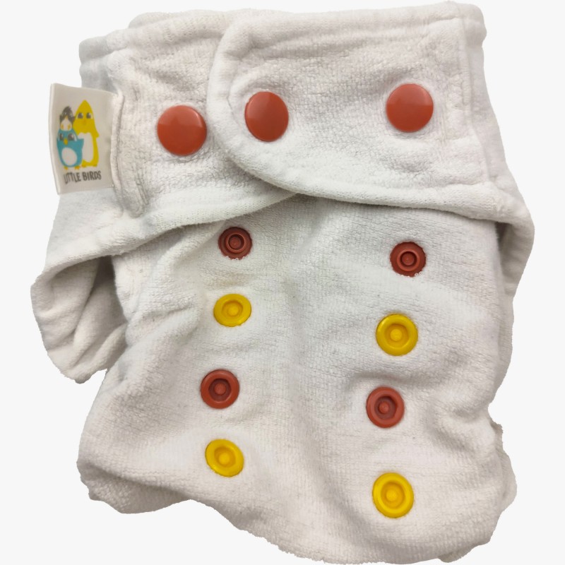 Ajustado de bolsillo Little Birds blanco. Talla Os hasta 12kg. Es todo material absorbente por lo que necesita cobertor. Uso medio