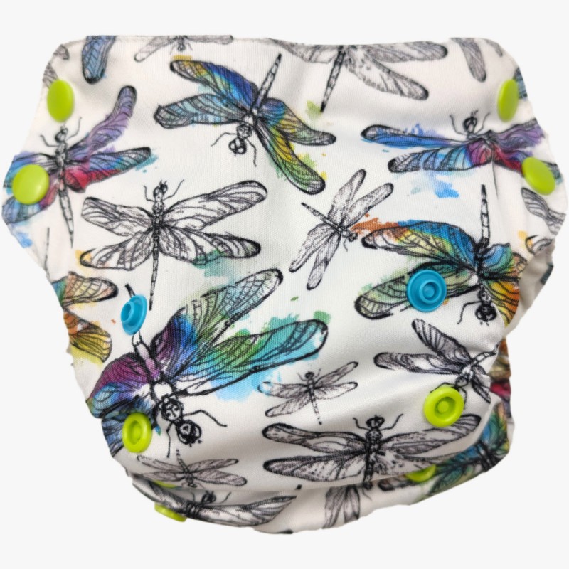 Pañal de bolsillo de algodon de marca Magabi. Estampado libélulas Talla M (mini unitalla o MiniOs) de 4 a 10kg corte pants. Uso medio.
