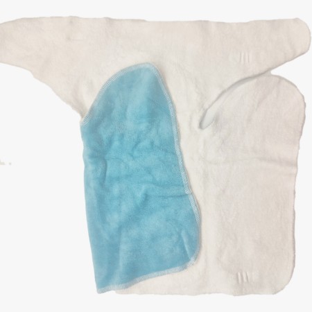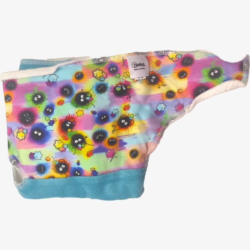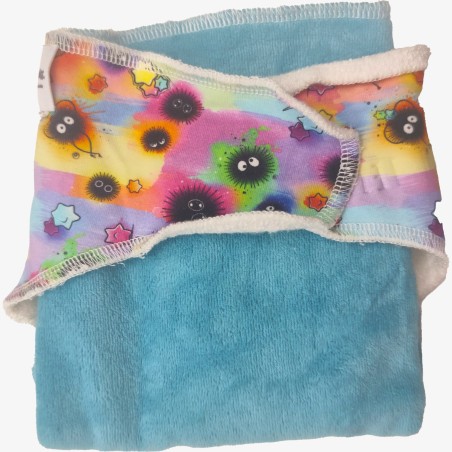 El exterior del pañal es de velour de algodón y punto de algodón estampado motas de Studio Ghibli, el interior es de suave rizo de bambú al 80% y algodón orgánico al 20% con un refuerzo interior oculto de cáñamo al 55% y algodón orgánico al 45% para una absorción duradera. Al doblarlo queda en contacto el velour de algodón que aporta efecto semi seco, para garantizar la máxima suavidad y confort a la delicada piel de tu bebé.