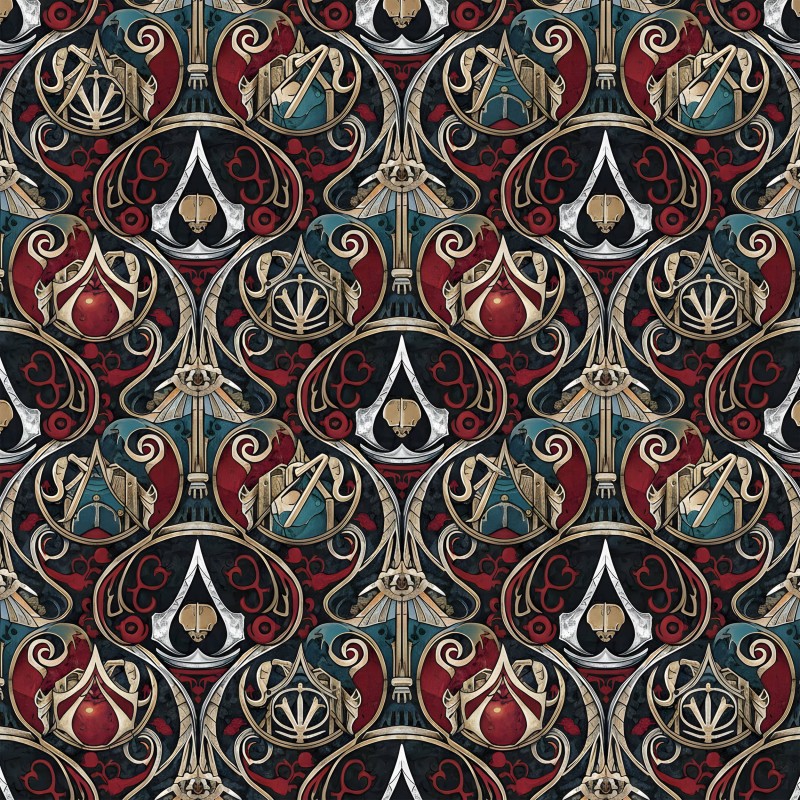Retal de tela diseño inspirado en el videojuego Assassin Creed con opción de diferentes tejidos. Una unidad corresponde a 0'50 cm por el ancho de la tela, dos unidades 1 metro. Se envían todas las unidades continuas, sin cortes.