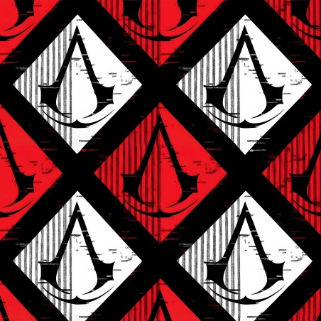 Retal de tela diseño inspirado en el videojuego Assassin Creed en tonos rojo, negro y blanco con opción de diferentes tejidos. Una unidad corresponde a 0'50 cm por el ancho de la tela, dos unidades 1 metro. Se envían todas las unidades continuas, sin cortes.