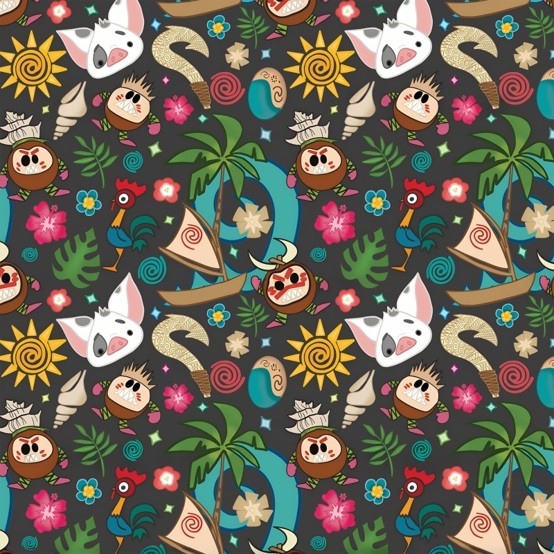 Diseño de logos de la pelicular de Vaiana en punto camiseta de algodón de venta por metro. Una unidad son 50cm (medio metro) por el ancho de la tela
